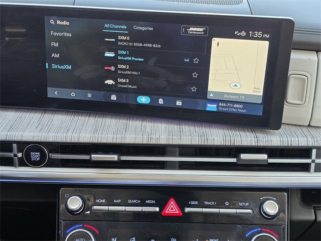 - Radio: AM/FM/HD Bose Premium Audio System -inc: 12 speakers including subwoofer, external amplifier, 12.3" wide touchscreen, Apple CarPlay and Android Auto, Bluetooth® hands-free w/wireless audio streaming, dynamic voice recognition, USB connectivity, SiriusXM, Blue Link connected car system, navigation system including traffic flow w/incident data via HD Radio (HERE) and rear seat quiet mode